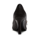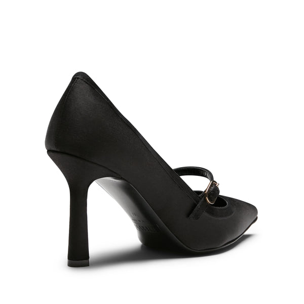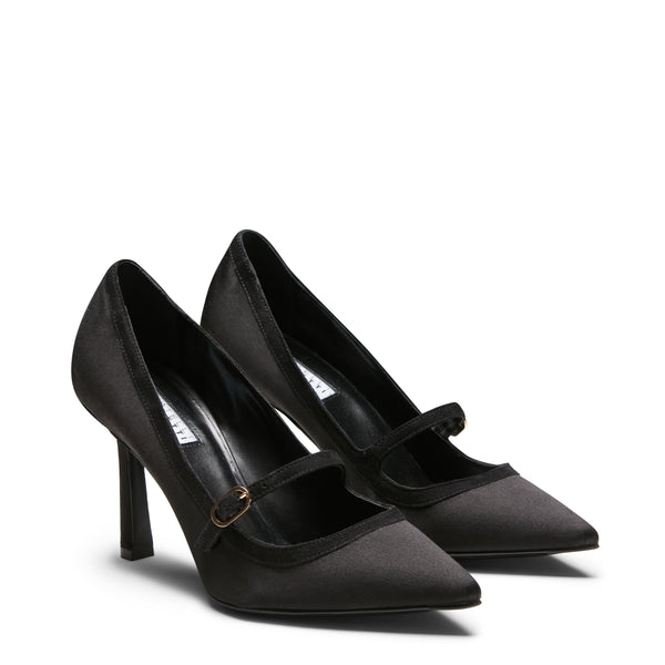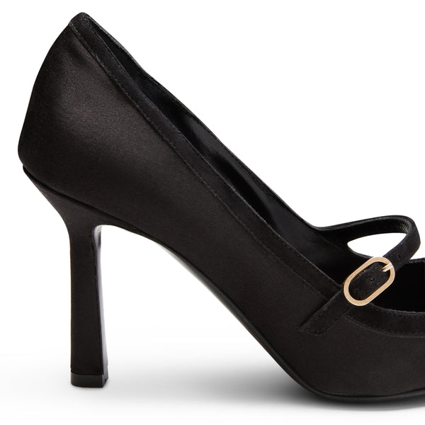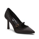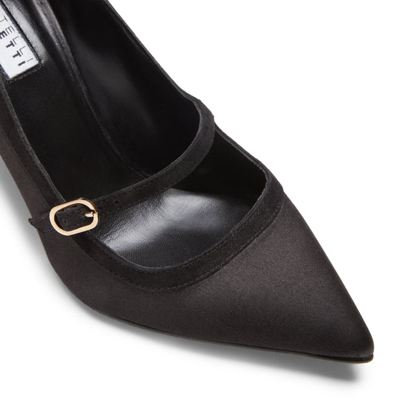 Elegante zapato de salón en raso negro con ribetes de piel a tono. Modelo elegante y ultrafemenino con un fino tacón de 90 mm. La correa con hebilla ajustable da un encanto retro a este zapato de forma puntiaguda. Suela de cuero negra a juego con el forro.