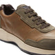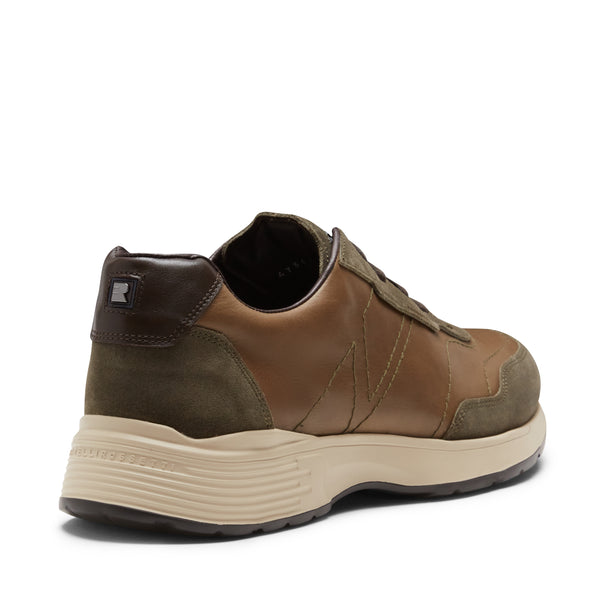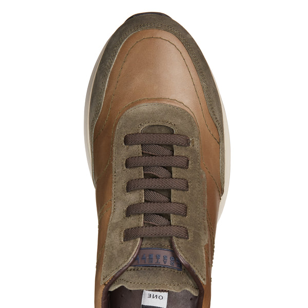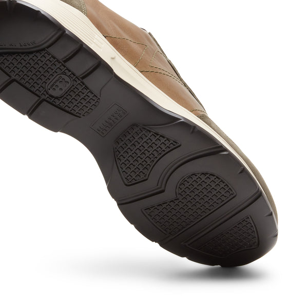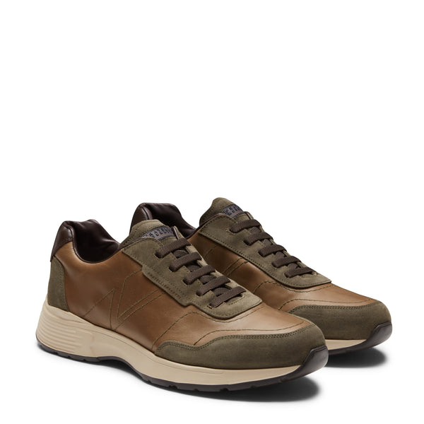 Zapatilla de estilo deportivo confeccionada en ante combinado con cuero liso de color verde musgo. El cuero se sumerge en el color y luego se acaba con cepillos abrasivos, una combinación perfecta entre un estilo deportivo y detalles sofisticados. El calzado presenta costuras en los laterales de la empella que crean diseños geométricos. Suela especial de goma bicolor.