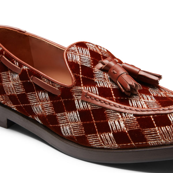 El icónico mocasín Brera se viste de elegancia para la noche con un refinado tejido negro con bordados geométricos y aplicaciones de hilo de lúrex plateado, que añaden un delicado toque de luz. Los ribetes y las borlas, en piel a juego, completan el diseño al conferirle al zapato un aspecto sofisticado y contemporáneo. Suela de cuero negra a juego con el forro.