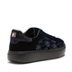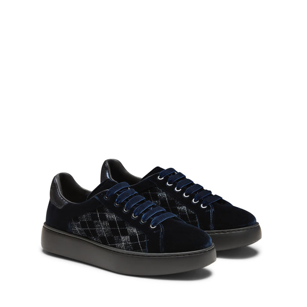 Deportivas de estilo refinado confeccionadas en suave terciopelo azul marino. Los laterales de la parte superior están confeccionados en tejido con bordados geométricos e inserciones de hilos de lurex plateado, que añaden un delicado toque de luminosidad. Suela de goma con dibujo personalizado antideslizante, que garantiza comodidad y ligereza.