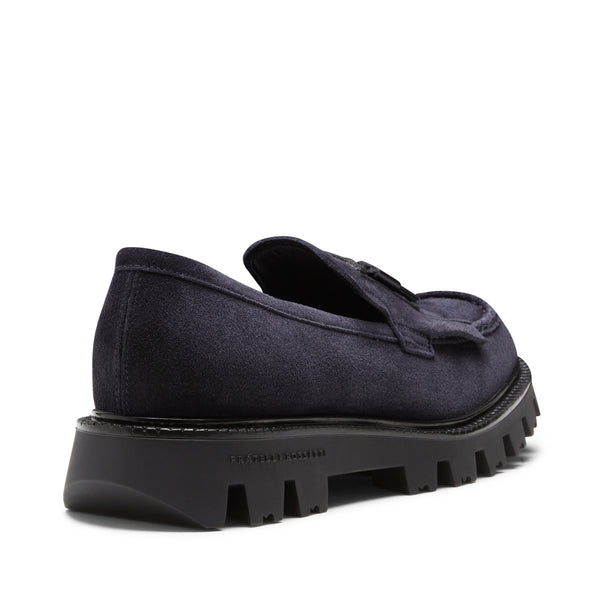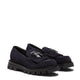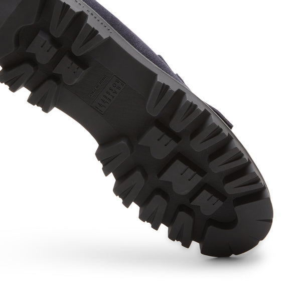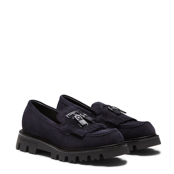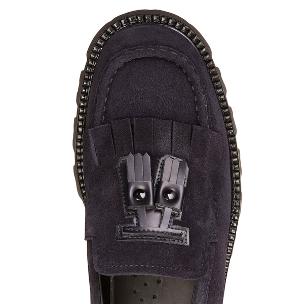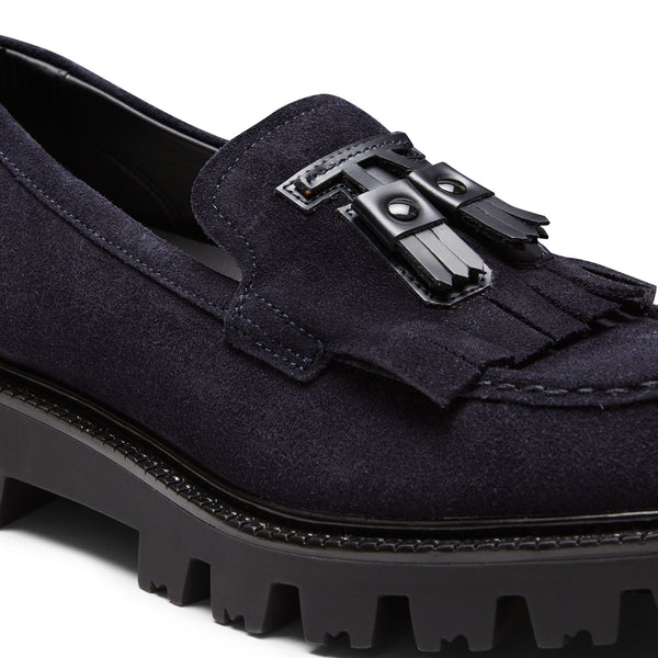 Mocassin de forme carrée en daim bleu marine avec effet semi-brillant. Les pampilles iconiques cousues en relief caractérisent cette chaussure au look exclusif et métropolitain. La semelle en caoutchouc donne à la chaussure un look dynamique et audacieux.