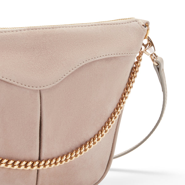 Pochette della linea Claire realizzata in raffinata pelle scamosciata color beige corda. Borsa dalle dimensioni contenute ma sufficientemente capiente da contenere gli accessori personali. Si caratterizza per il suo design morbido e per le due tracolle, in pelle e a catenella, entrambe rimovibili. Chiusura con zip.