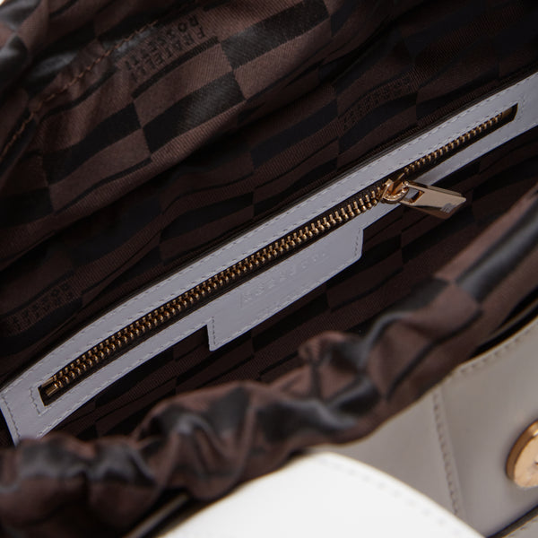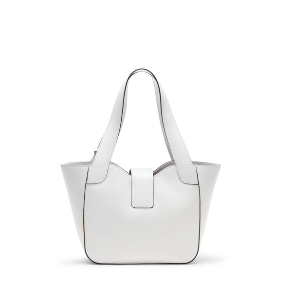 Version raffinée du petit sac cabas de la ligne Lisetta. Caractérisé par des lignes douces et essentielles agrémentées de détails artisanaux tels que les profils lissés marron et la présence de l’accessoire breloque à logo. Structuré et polyvalent, il est réalisé en cuir blanc souple avec une finition nappa.