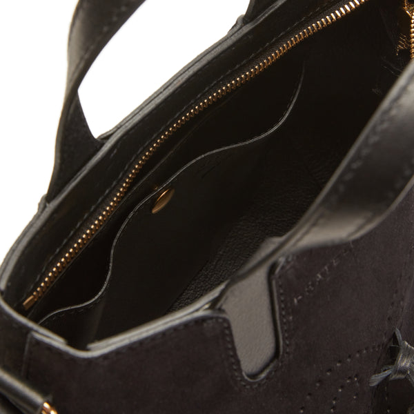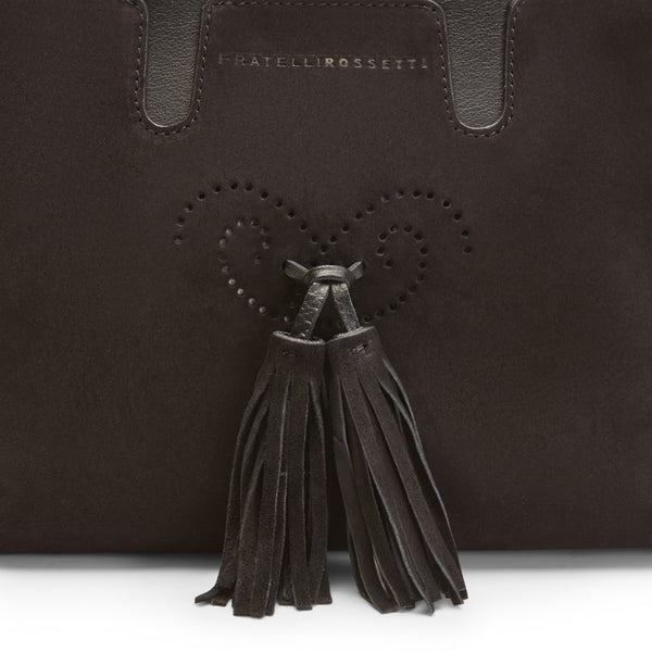 Sac à main raffiné de la ligne Hobo, réalisé en daim noir souple. Spacieux malgré sa taille compacte, il est doté d'une bandoulière et d'une poignée en cuir lisse du même ton. Doté de détails artisanaux, tels que la perforation emblématique de la fleur et les pompons surdimensionnés traditionnels, il est complété par une poche intérieure zippée et des poches fendues.Art. 84767